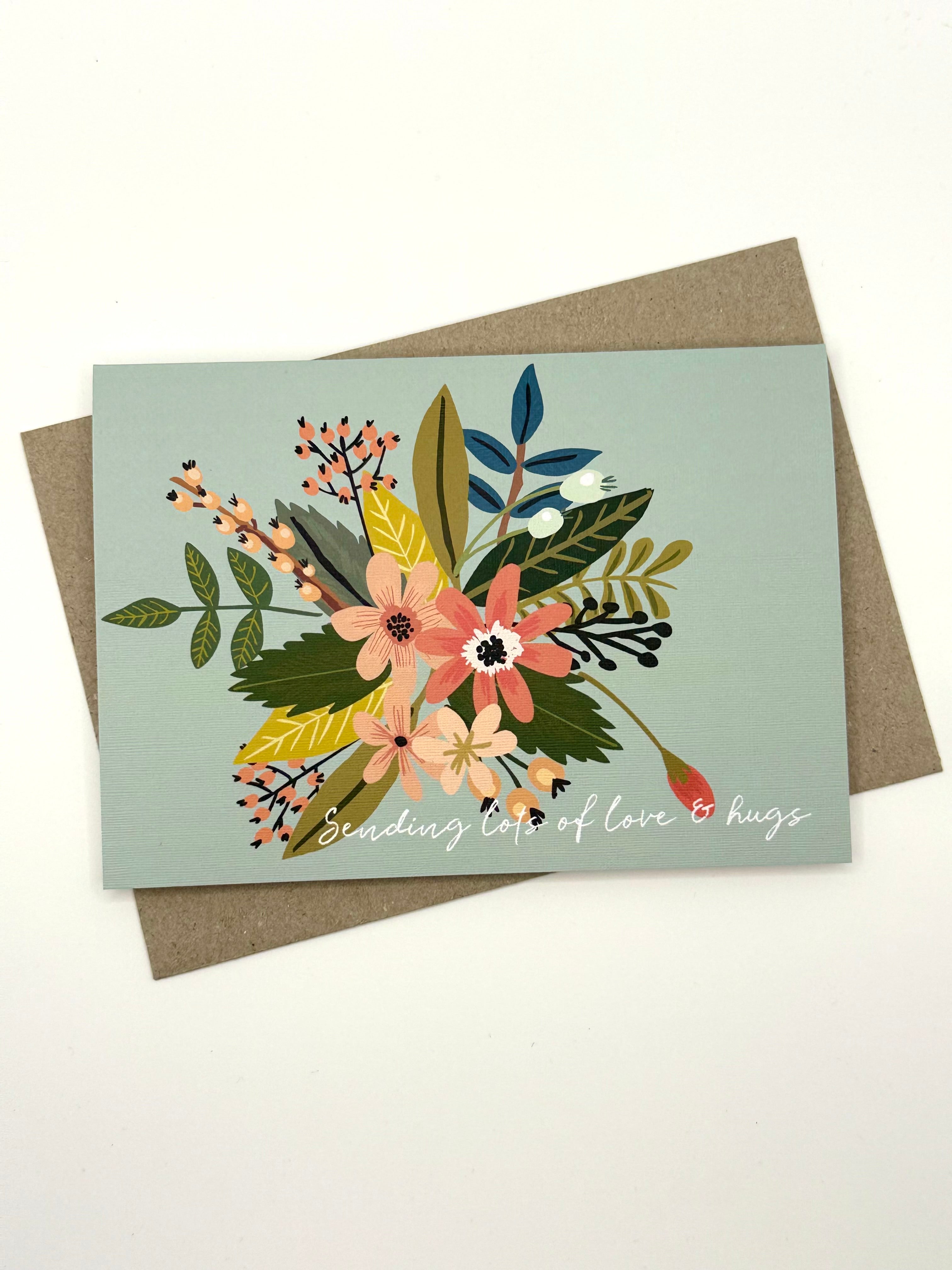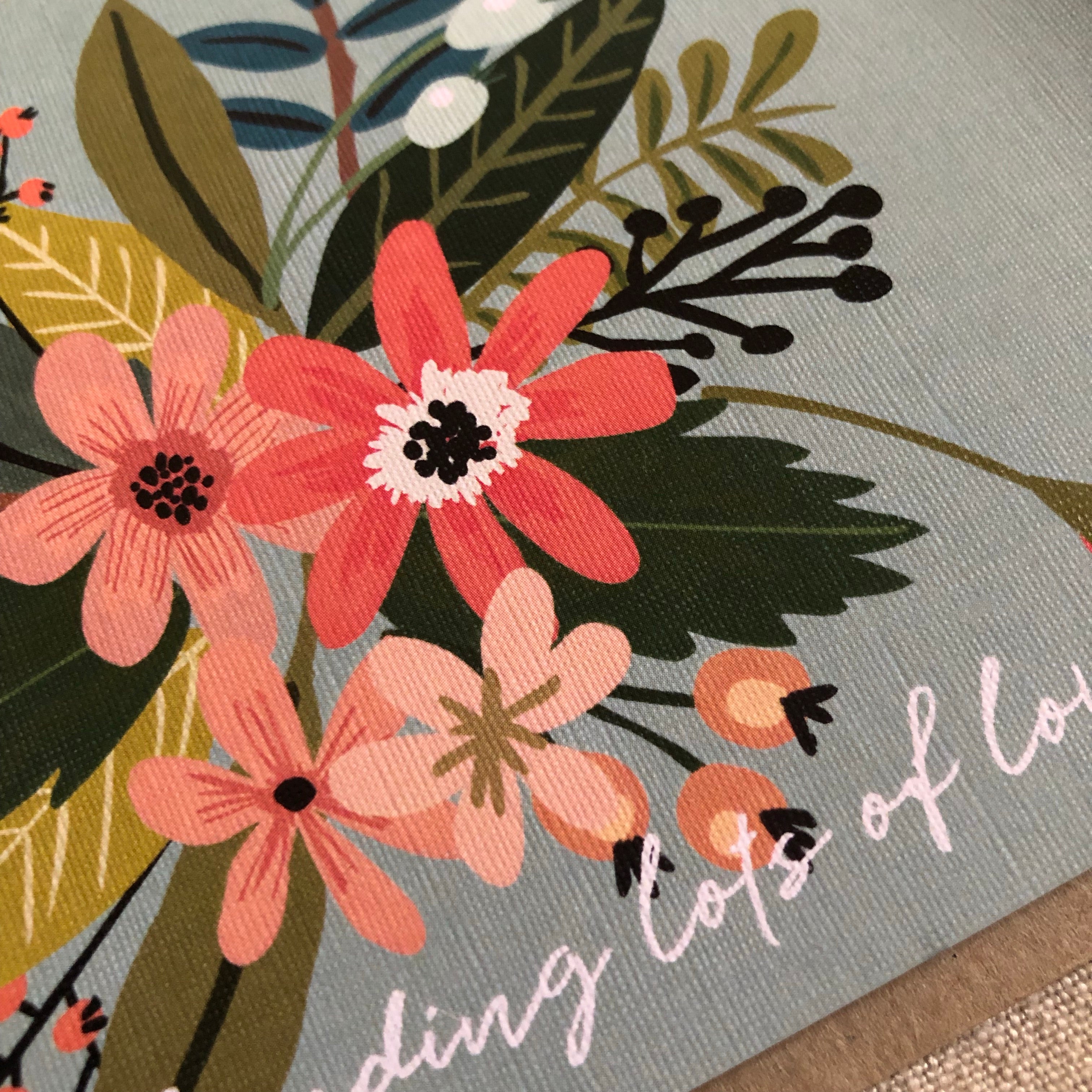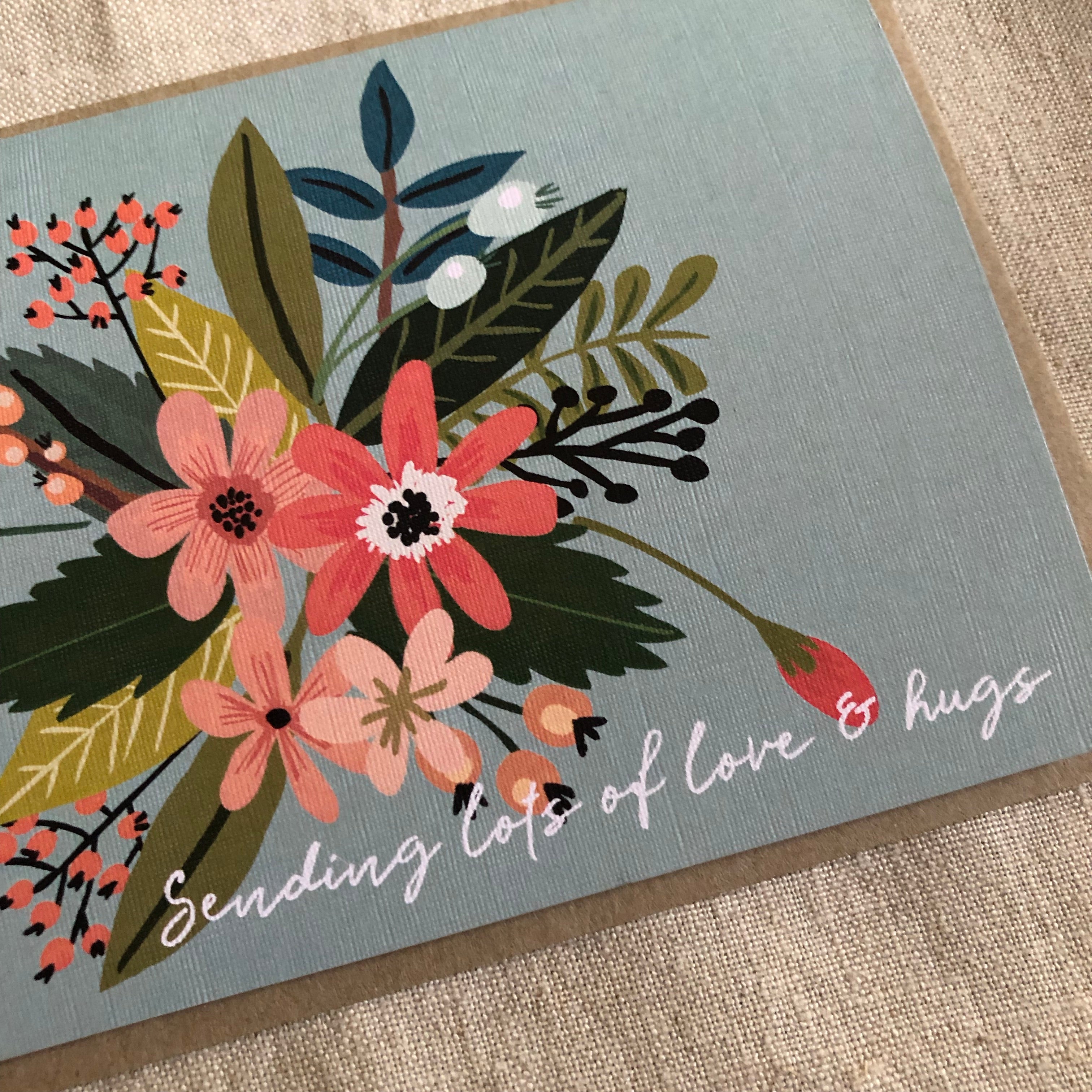 Digitally printed on 330gsm white textured linen stock. Each card comes with a brown kraft envelope and in a clear cello slip.