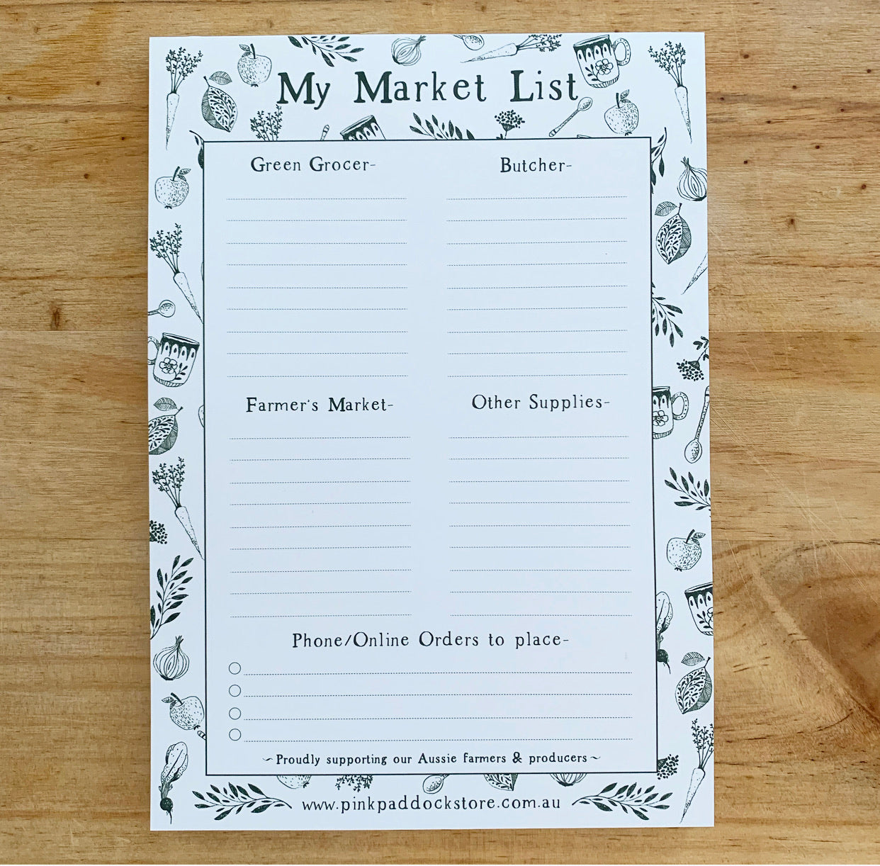 Our 'Farmer's Market List' Notepad in A5 size, allows you to list your weekly orders from your local Green Grocer, Butcher, Farmers Market, other local businesses and of course, a reminder for any online or phone orders too.