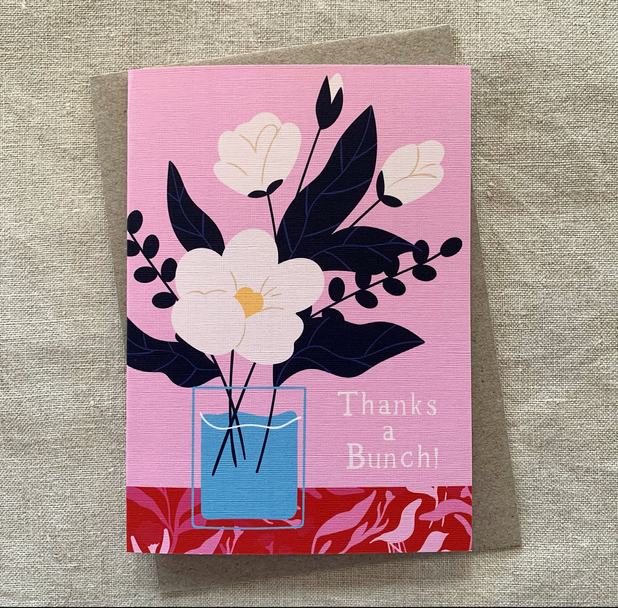 Printed on a white textured linen card (350gsm) and comes with brown kraft envelope.