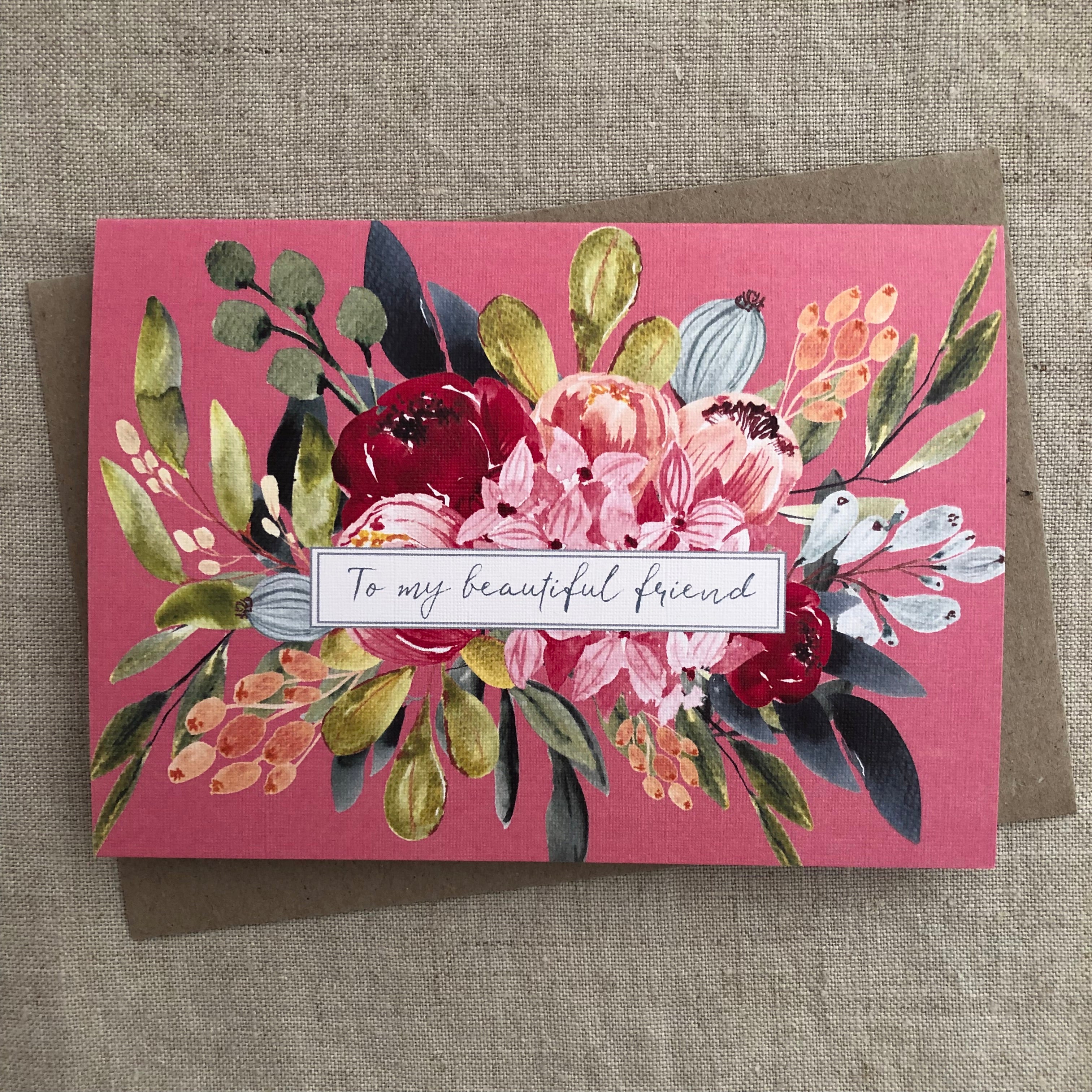 Digitally printed on 330gsm white textured linen stock. Each card comes with a brown kraft envelope and in a clear cello slip.